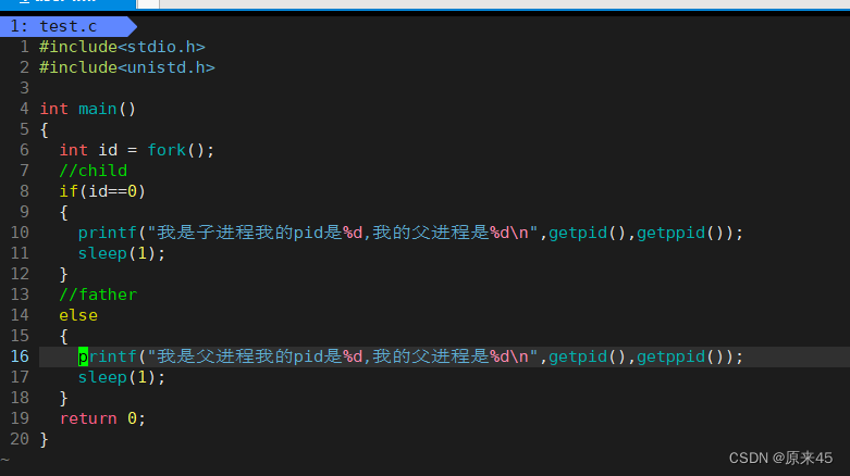 fork之后,父子进程会共享代码,一般都会执行后续代码,fork之后父子进程返回值不同,可以通过不同的返回值,判断让父子执行不同的代码块!