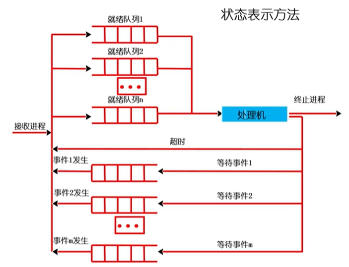 - 不同的状态分别用不同的队列来表示(就绪队列、各种类型的阻塞队列)