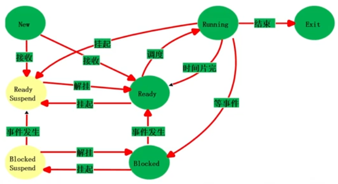 - 运行到就绪挂起:对抢先式分时系统,当有高优先级阻塞挂起进程因事件出现而进入就绪挂起时,系统可能回吧运行进程转到就绪挂起状态