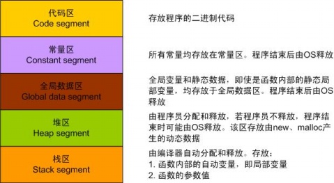 | 存储内容 | 在函数调用时,第一个进栈的是主函数中后的下一条指令(函数调用语句的下一条可执行语句)的地址,然后是函数的各个参数,在大多数的C编译器中,参数是由右往左入栈的,然后是函数中的局部变量。注意静态变量是不入栈的。 当本次函数调用结束后,局部变量先出栈,然后是参数,最后栈顶指针指向最开始存的地址,也就是主函数中的下一条指令,程序由该点继续运行。 | 一般是在堆的头部用一个字节存放堆的大小。堆中的具体内容有程序员安排。 |