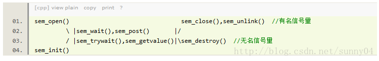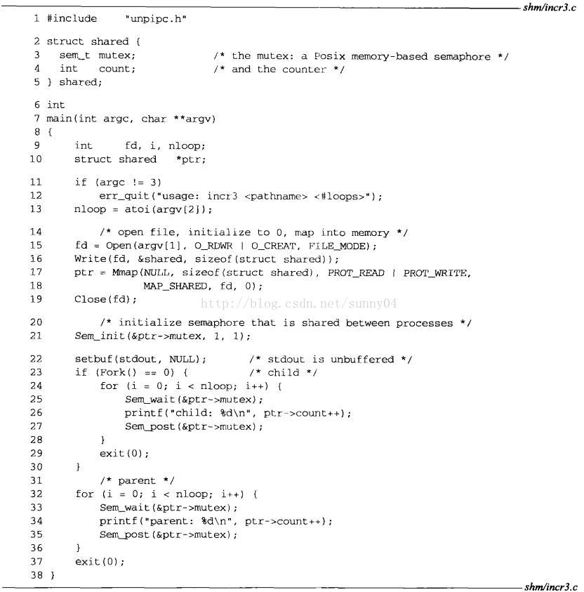 struct shareMemory { sem_t sem; char *buffer[MAX]}; 在共享内存区上面分配一个这样大小的内存,然后调用 sem_init(&shareMemory.sem, 1, 1). 这里需要注意的是sem_init()只能被调用一次。对一个已经初始化的信号量调用sem_init(),其结果是未定义的。 也就是说 主线程或者主进程调用 sem_init()后,另外的线程或者进程不允许再次调用sem_init(),这个另外的线程或者进程可以直接使用 shareMemory.sem进行同步。