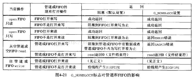 如果当前打开操作是为读而打开FIFO时,若已经有相应进程为写而打开该FIFO,则当前打开操作将成功返回;否则,可能阻塞直到有相应进程为写而打开该FIFO(当前打开操作设置了阻塞标志);或者,成功返回(当前打开操作没有设置阻塞标志)。