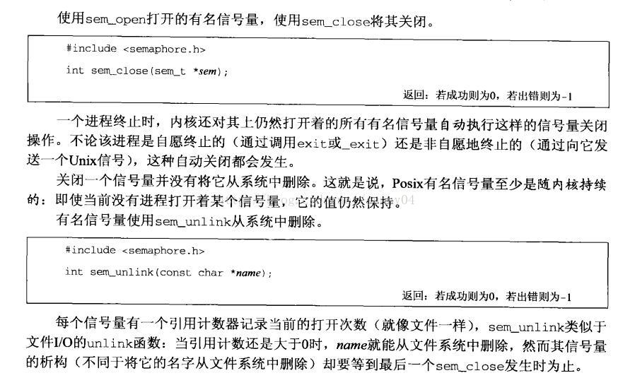 一般主线程或者主进程调用 sem_t *sem_open(const char *name, int oflag, mode_t mode, unsigned int value) 来创建一个新的信号量, mode_t mode 设置为O_CREAT。另外一个线程或者经常使用sem_t *sem_open(const char *name, int oflag)来打开一个已经存在的信号量。