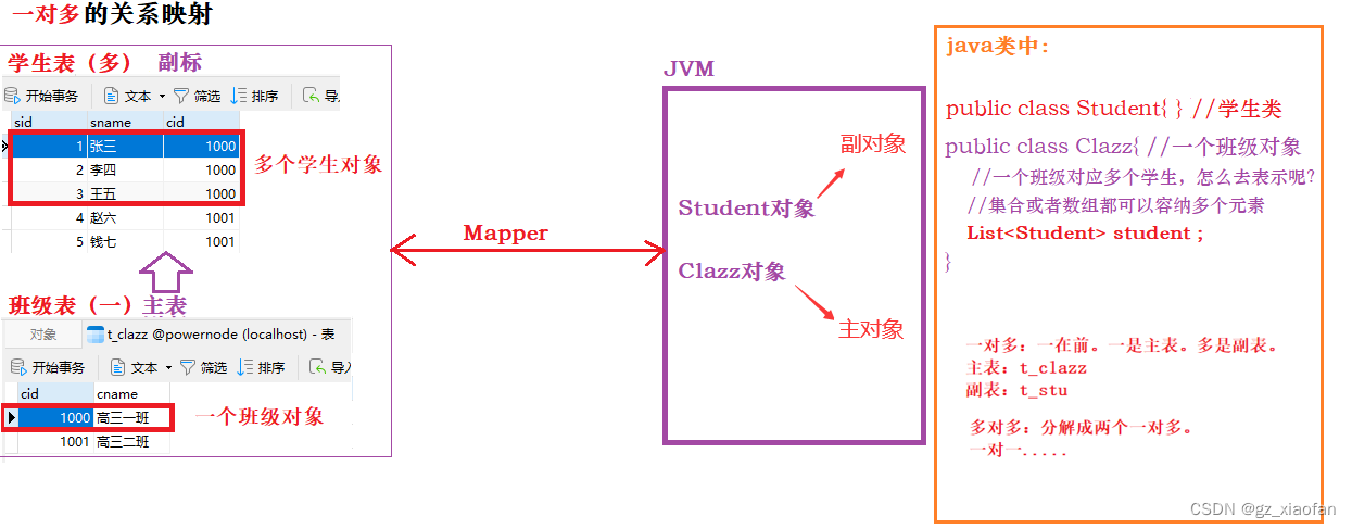 多对一常见的表示方式:pojo类Student中添加⼀个属性:Clazz clazz; 表示学⽣关联的班级对象。
