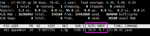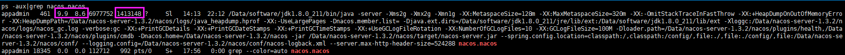 第一个标注的地方是CPU和内存占用率,后面的1413148是物理内存使用量,单位为k,此时,nacos大约占用1413M内存,也即是1.4G的内存。