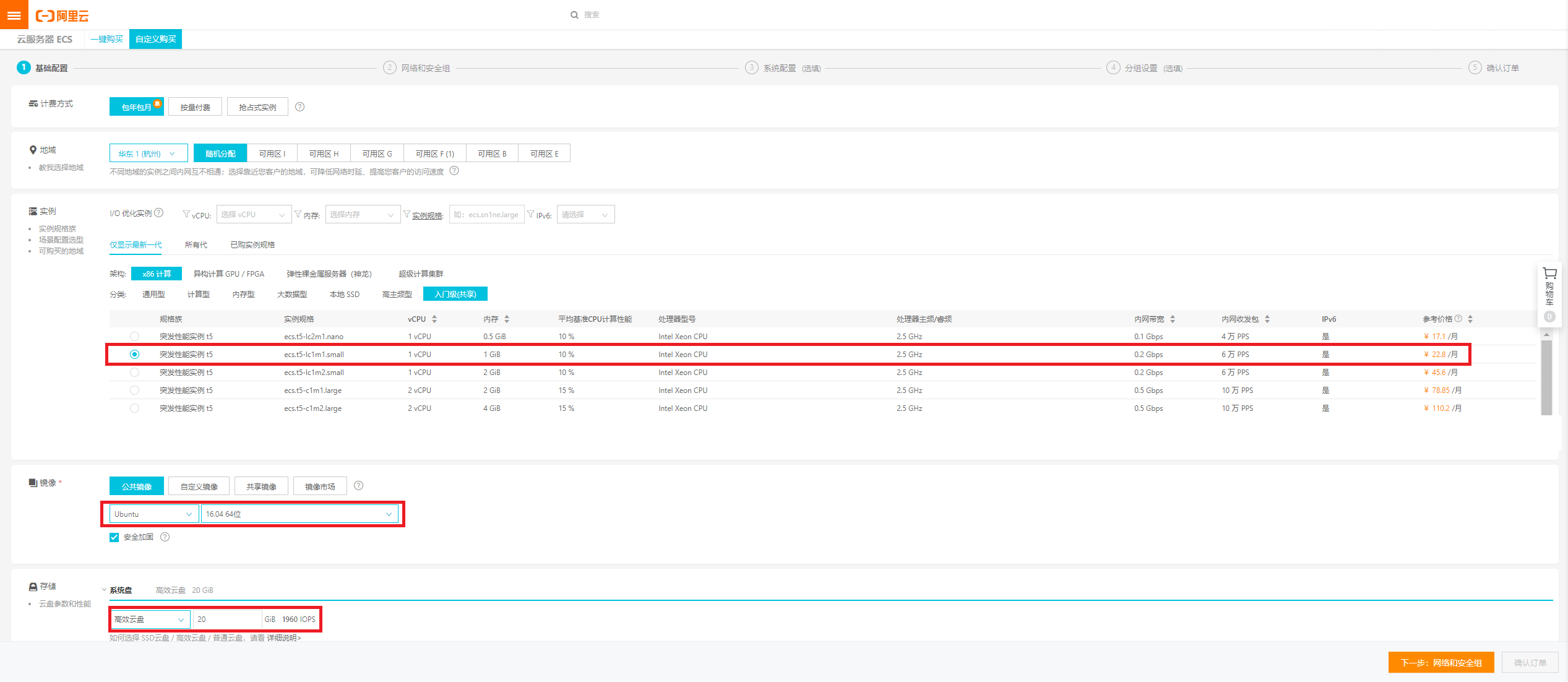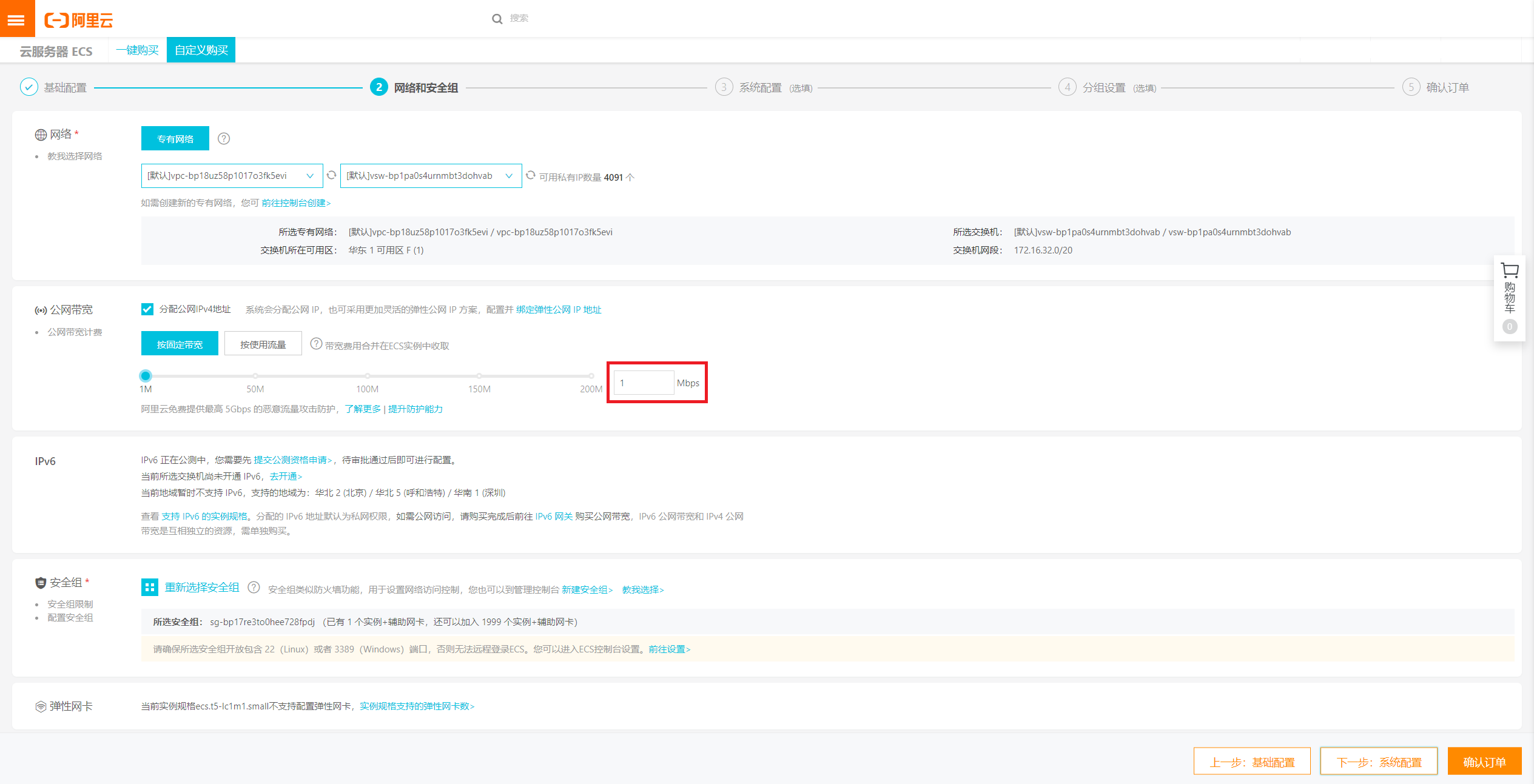 这页默认就行了,公网带宽选最低的 1M ,初期够用了。