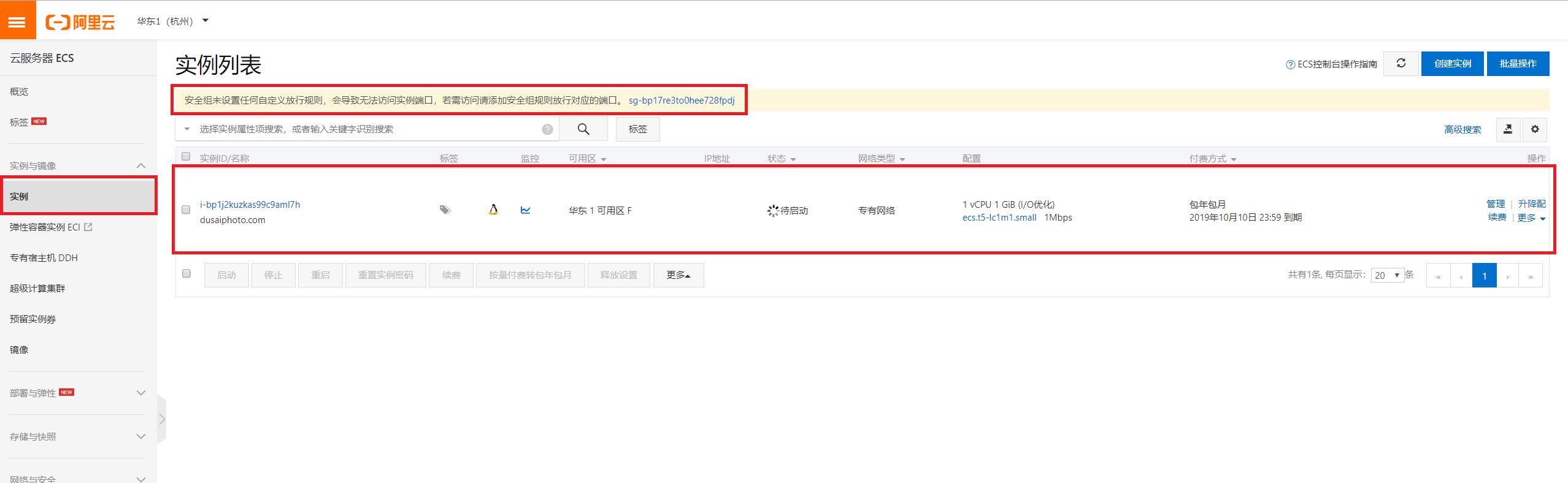 这里有时候会有黄字提醒你服务器的网络端口没开,点击黄字链接去开通一下: