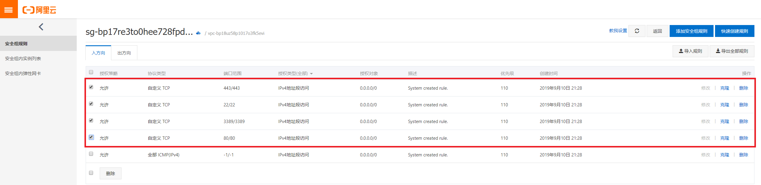 把 22(远程连接端口)、443(HTTPS端口)、80(HTTP端口)都打开,3389端口顺便也开了。