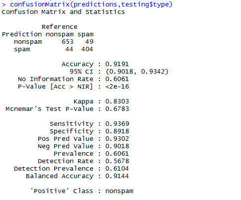 想知道模型预测的准确率如何呢?这个时候就要用到错误分类矩阵了,将模型预测的值和真实的值进行比较,计算错误分类率。通过观察错误分类矩阵,我们可知准确率为0.9333,结果还是很理想的。但是本次举的例子不太好,主要可能是划分训练集和测试集时太随意了。但是大体的过程就是这样了