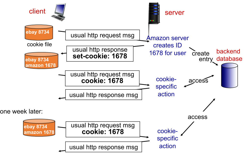 小王的电脑上有些cookie文件,第一次访问亚马逊时,亚马逊会创建一个ID,例如1678,然后放在后端的数据库里面,同时它给小王发送响应报文时在响应报文的头部有一个set-cookie字段,值为1678,当小王的浏览器收到响应报文后,它就会把1678这样的ID以及对应站点的信息amazon放到cookie文件里面。过了一段时间当小王再次访问亚马逊时,在请求报文里面会带上cookie这个首部,而cookie的值为1678,当亚马逊服务器收到请求报文后就会知道是小王,这样就达到了跟踪用户的目的。