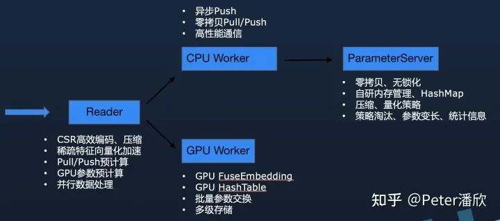 GPU和相应的高速网络链接可以解决这一问题。单台8卡机器通过NVLink连接起来,速度甚至可以超过几十台物理机,有更高的性价比。但是由于几百GB,甚至TB级的参数问题,还有Embedding的GPU计算问题,导致GPU一直都没有被广泛的用起来。