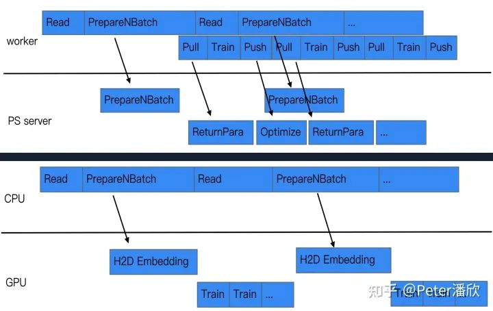 同样,当使用GPU训练时,也可以在数据IO的并行过程中,预计算未来需要用的的Embedding参数。这样GPU训练下一轮的数据时,需要用到的Embedding已经提前被计算好,可以直接开始训练,减少来等待的时间。