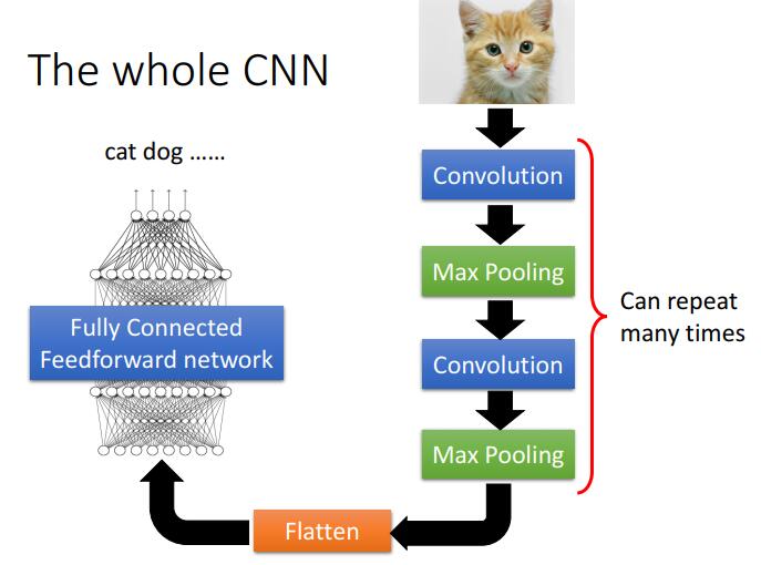 通常情况下,一个CNN包含多次的卷积、池化,然后Flatten,最终再通过一个深度神经网络进行学习预测。CNN在图像、语音识别取得非常好的成绩,核心的想法在于一些物体的特征往往可以提取出来,并且可能出现在图片的任何位置,而且通过卷积、池化可以大大减少输入数据,加快训练效率。