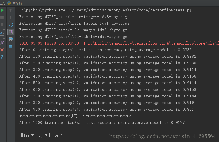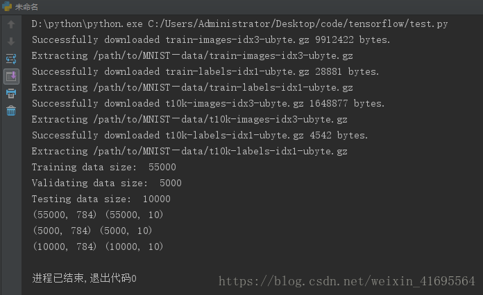 首先对MNIST数据进行加载,为了方便使用,TensorFlow提供了一个类来处理MNIST数据。这个类会自动下载并转化MNIST数据的格式,将数据从原始的数据包中解析成训练和测试神经网络时使用的格式。下面给出了使用这个函数的样例在,我们在pycharm中直接运行下面的代码: