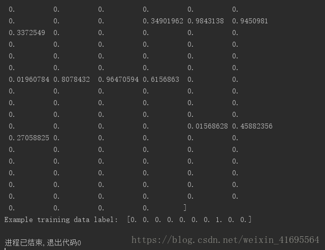 从上面的代码中可以看出,通过input_data.read_data_sets函数生成的类会自动将 MNIST数据集划分为train、validation和test三个数据集,其中train这个集合内有55000 张图片,validation集合内有5000张图片,这两个集合组成了 MNIST本身提供的训练数据集。test集合内有10000张图片,这些图片都来自于MNIST提供的测试数据集。处理后的 每一张图片是一个长度为784的一维数组,这个数组中的元素对应了图片像素矩阵中的每一个数字(28x28=784)。因为神经网络的输入是一个特征向量,所以在此把一张二维图像 的像素矩阵放到一个一维数组中可以方便TensorFlow将图片的像素矩阵提供给神经网络的输入层。像素矩阵中元素的取值范围为[0, 1],它代表了颜色的深浅。其中0表示白色背景 (background ) , 1表示黑色前景(foreground )。