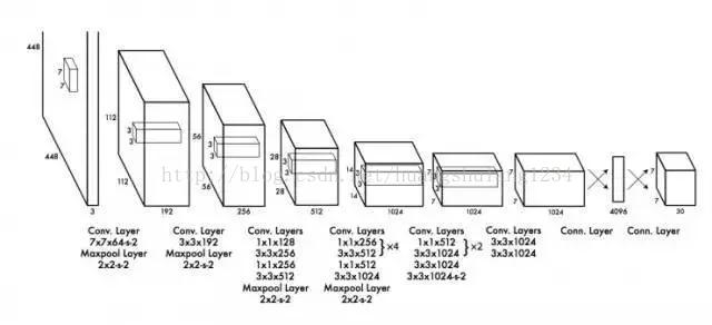 虽然与其对应的RCNN相比,YOLO的性能降低了,但是它的实时处理功能在处理日常问题中仍有巨大的优势。以下是YOLO网络架构: