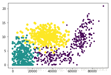 ax.scatter(datingDataMat[:,0],datingDataMat[:,2],15.0*array(datingLabels),15.0*array(datingLabels))