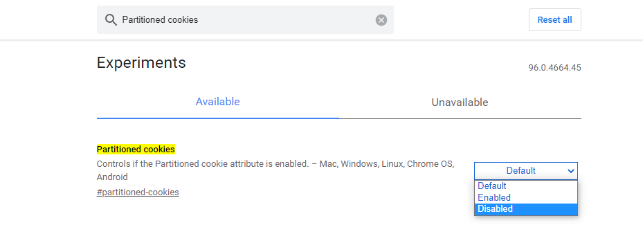 2、 把 Partitioned cookies 项将设置项改为Enabled