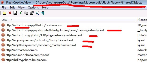 有个工具叫“flashcookiesview”,可以用这个工具直接打开当前电脑上所存储的flashcookies,如下图: