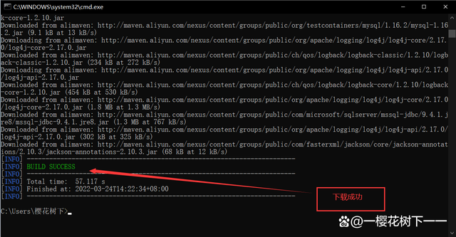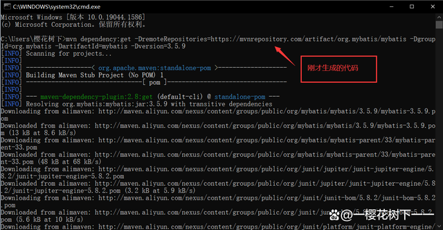 五、win+R输入cmd打开命令窗口,执行刚才生成的代码:mvn dependency:get -DremoteRepositories=https://mvnrepository.com/artifact/org.mybatis/mybatis -DgroupId=org .mybatis -DartifactId=mybatis -Dversion=3.5.9