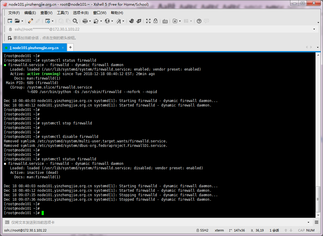 [root@node101 ~]# systemctl status firewalld ● firewalld.service - firewalld - dynamic firewall daemon Loaded: loaded (/usr/lib/systemd/system/firewalld.service; enabled; vendor preset: enabled) Active: active (running) since Tue 2018-12-18 08:40:12 EST; 26min ago Docs: man:firewalld(1) Main PID: 689 (firewalld) CGroup: /system.slice/firewalld.service └─689 /usr/bin/python -Es /usr/sbin/firewalld --nofork --nopid Dec 18 08:40:03 node101.yinzhengjie.org.cn systemd[1]: Starting firewalld - dynamic firewall daemon... Dec 18 08:40:12 node101.yinzhengjie.org.cn systemd[1]: Started firewalld - dynamic firewall daemon. [root@node101 ~]# [root@node101 ~]# [root@node101 ~]# [root@node101 ~]# systemctl stop firewalld [root@node101 ~]# [root@node101 ~]# [root@node101 ~]# systemctl disable firewalld Removed symlink /etc/systemd/system/multi-user.target.wants/firewalld.service. Removed symlink /etc/systemd/system/dbus-org.fedoraproject.FirewallD1.service. [root@node101 ~]# [root@node101 ~]# [root@node101 ~]# systemctl status firewalld ● firewalld.service - firewalld - dynamic firewall daemon Loaded: loaded (/usr/lib/systemd/system/firewalld.service; disabled; vendor preset: enabled) Active: inactive (dead) Docs: man:firewalld(1) Dec 18 08:40:03 node101.yinzhengjie.org.cn systemd[1]: Starting firewalld - dynamic firewall daemon... Dec 18 08:40:12 node101.yinzhengjie.org.cn systemd[1]: Started firewalld - dynamic firewall daemon. Dec 18 09:07:35 node101.yinzhengjie.org.cn systemd[1]: Stopping firewalld - dynamic firewall daemon... Dec 18 09:07:36 node101.yinzhengjie.org.cn systemd[1]: Stopped firewalld - dynamic firewall daemon. [root@node101 ~]#