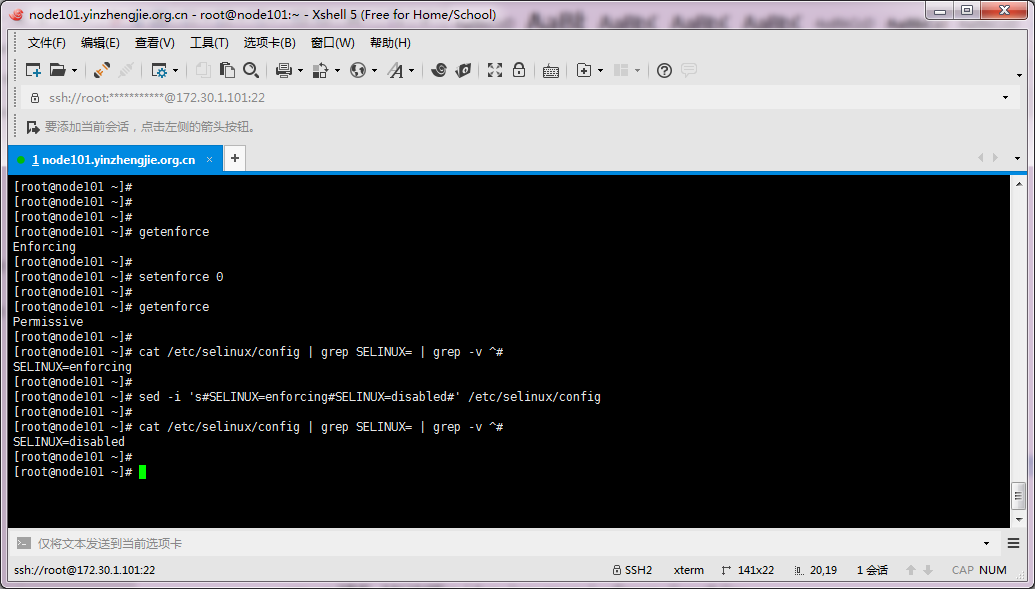 [root@node101 ~]# getenforce Enforcing [root@node101 ~]# [root@node101 ~]# setenforce 0 [root@node101 ~]# [root@node101 ~]# getenforce Permissive [root@node101 ~]# [root@node101 ~]# cat /etc/selinux/config | grep SELINUX= | grep -v ^# SELINUX=enforcing [root@node101 ~]# [root@node101 ~]# sed -i 's#SELINUX=enforcing#SELINUX=disabled#' /etc/selinux/config [root@node101 ~]# [root@node101 ~]# cat /etc/selinux/config | grep SELINUX= | grep -v ^# SELINUX=disabled [root@node101 ~]#
