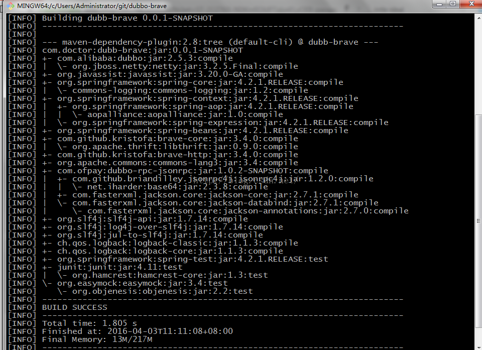 在项目目录下执行命令: mvn dependency:tree