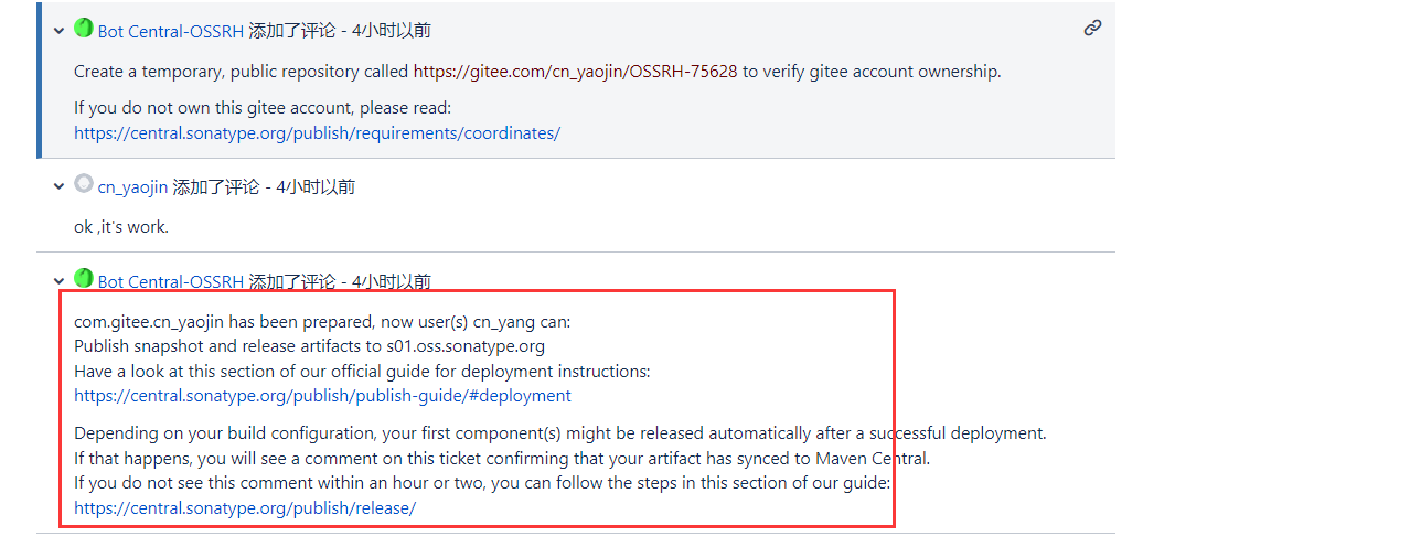 图中的意思是,在gitee上建一个项目,名字:OSSRH-75628,该项目里面可以为空,但是权限设置为公共,意思是别人也可以访问,只要这个地址是通的就可以。配置好以后,回复一段话给官方,内容随便,比如我回复的:ok,it's work. 官方会验证这个链接是不是通的,主要证明cn_yaojin这个账号是我。