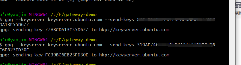 # 4. 发布公钥到服务器(公钥在上面 list-keys命令中查看),发布是否成功,一般在他的返回信息中你可以看明白