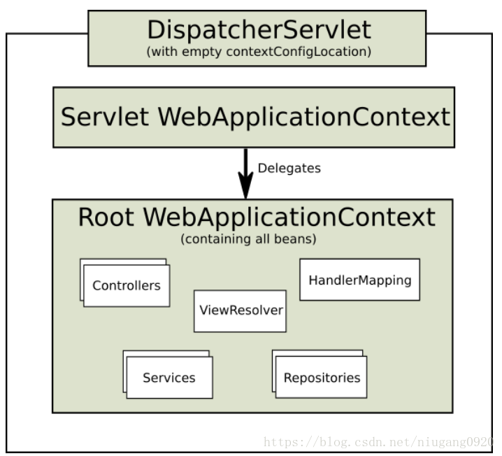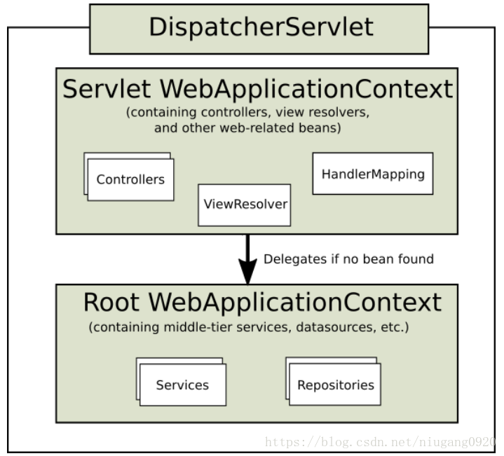 从上图可以看到Servlet WebApplicationContext 主要是配置web相关的,如controller 、视图解析器、处理器映射。Root WebApplicationContext主要是来配置service和repsoitories.这就是我们常用的分开配置.