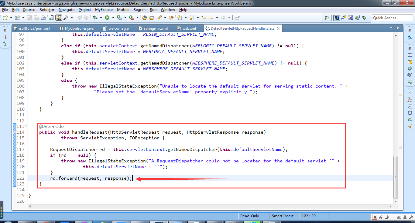 注意:default-servlet-handler会对静态资源的访问请求通过handlerMapping映射到默认的Servlet请求处理器DefaultServletHttpRequestHandler类上。而该类最终调用的是Tomcat的defaultServlet来处理的请求。如图: