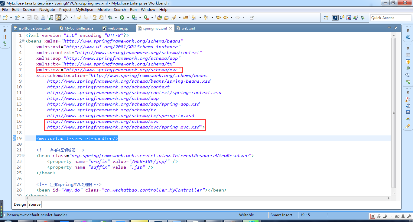 <?xml version="1.0" encoding="UTF-8"?> <beans xmlns="http://www.springframework.org/schema/beans" xmlns:xsi="http://www.w3.org/2001/XMLSchema-instance" xmlns:context="http://www.springframework.org/schema/context" xmlns:aop="http://www.springframework.org/schema/aop" xmlns:tx="http://www.springframework.org/schema/tx" xmlns:mvc="http://www.springframework.org/schema/mvc" xsi:schemaLocation="http://www.springframework.org/schema/beans http://www.springframework.org/schema/beans/spring-beans.xsd http://www.springframework.org/schema/context http://www.springframework.org/schema/context/spring-context.xsd http://www.springframework.org/schema/aop http://www.springframework.org/schema/aop/spring-aop.xsd http://www.springframework.org/schema/tx http://www.springframework.org/schema/tx/spring-tx.xsd http://www.springframework.org/schema/mvc http://www.springframework.org/schema/mvc/spring-mvc.xsd"> <mvc:default-servlet-handler/> <!-- 注册视图解析器 --> <bean class="org.springframework.web.servlet.view.InternalResourceViewResolver"> <property name="prefix" value="/WEB-INF/jsp/" /> <property name="suffix" value=".jsp" /> </bean> <!-- 注册SpringMVC处理器 --> <bean id="/my.do" class="cn.wechatbao.controller.MyController"></bean> </beans>