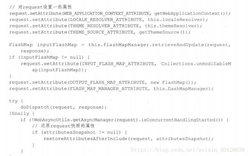 DispatcherServlet里面执行处理的入口方法是doService,不过doService并没有直接处理,而是交给了doDispatch去处理,在处理前,doService做了一部分事情.先判断请求是不是include请求(要清楚forward和include的区别),如果是include请求,会对request的Attribute做一些快照备份,等doDispatch处理完请求,回复备份.除了做备份之外,还对request进行了一些设置:设置了webapplicontext,themsource,localresolver,themesolver.这四个属性用在handler和view中.除此之外doService还设置了flashmap,lashmapManager.