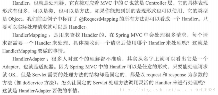 doDispatch主要做了四件事情:1.根据request找到handler; 2.根据handler找到handlerAdapter; 3.用handlerAdapter处理handler; 4.调用processDisachResult方法处理上面处理后的结果(包括找到view并渲染输出给客户端):那么handler,handlerAdapter,handlermapping都是什么呢?这是<看透springmvc源码与分析>一书中的介绍: