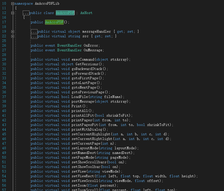 在该窗体类中生成了一个AxAcroPDFLib.AxAcroPDF的控件,进入该控件类可以看到控件类对外提供的方法,包括用于加载显示pdf的 LoadFile 方法,gotoFirstPage 等翻页的方法。