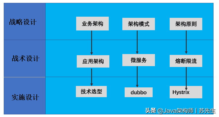 业务架构是战略,应用架构是战术,技术架构是装备。其中应用架构承上启下,一方面承接业务架构的落地,另一方面影响技术选型。
