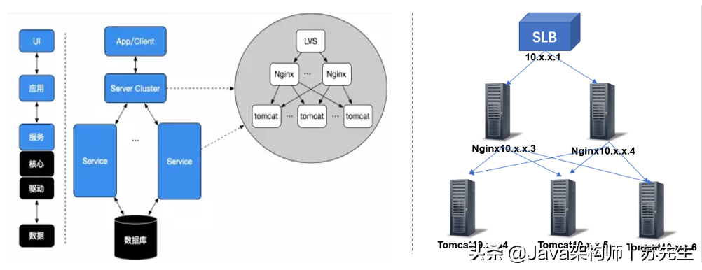 技术架构:确定组成应用系统的实际运行组件(lvs,nginx,tomcat,php-fpm等),这些运行组件之间的关系,以及部署到硬件的策略。