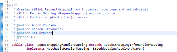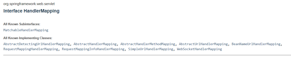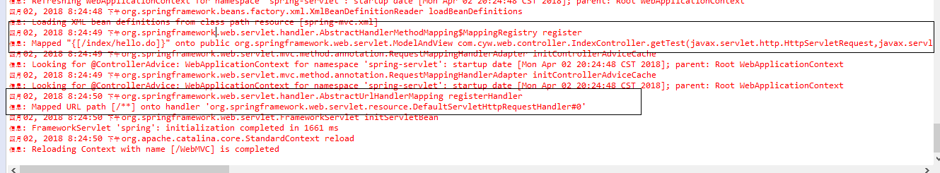 日志中用的例子还是JavaWeb之Eclipse中使用Maven构建SpringMVC项目 ,其实看日志能看出好多信息,在日志中可以找到黑框的信息。一个是通过AbstractHandlerMethodMapping将{[/index/hello.do]}映射到com.cyw.web.controller.IndexController.getTest方法上,第二个是通过AbstractUrlHandlerMapping将URL path [/**] 映射到handler 'org.springframework.web.servlet.resource.DefaultServletHttpRequestHandler。这只是列了两种映射方法,我们可以查看api文档来找(百度出来好多教程,可能是版本原因,在找对应的类时有的找不到,还是看api文档准确一些)。