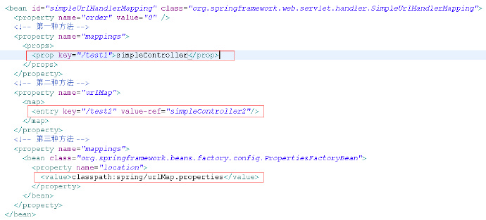 第三种方法和第一种方法类似,对SimpleUrlHandlerMapping的属性mapping进行注入,采用.properties文件的方式: