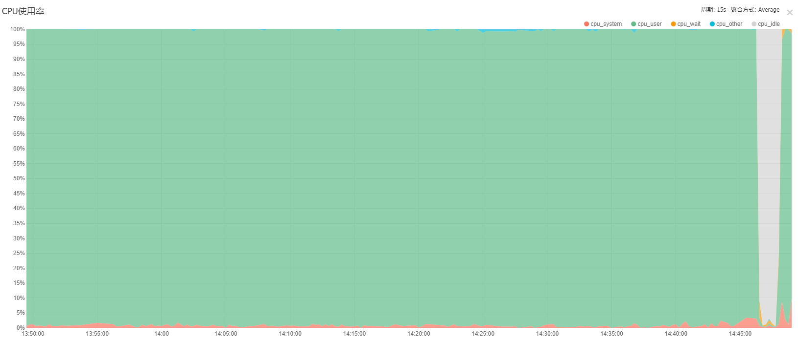 Server端开发人员都知道,开发程序的时候一定要尽可能避免BUG,尤其是直接导致CPU飙升的BUG,那么一旦出现了,反应在控制台上会是一个什么样的曲线呢?笔者在不影响服务的情况下做了一个小测试(阿里云ECS),结果如下: