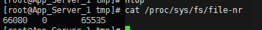 6)各项参数都正常,现在聚焦在打开的文件数这个问题上面。也可以用另外同一种方式查看一下内核统计文件 /proc/sys/fs/file-nr,比较一下差异,看看能不能找出问题。cat了一下,打开文件数是66080,果然超了!内核日志就以这个为标准。