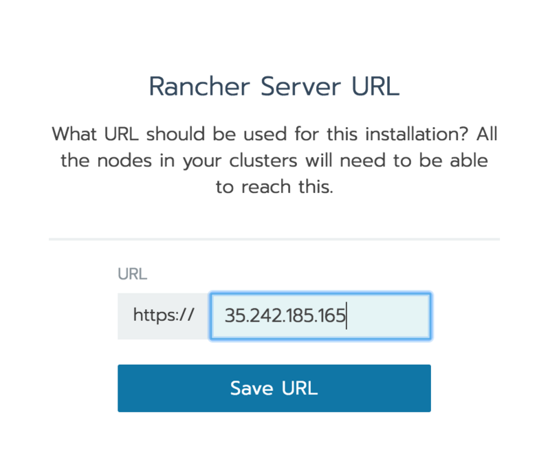 在这一页面上你需要设置Rancher Server的URL。在生产部署中这可能是一个主机名,比如rancher.yourcompany.com,但是如果你使用的是demo server,可以直接使用上面的EXTERNAL_IP地址。