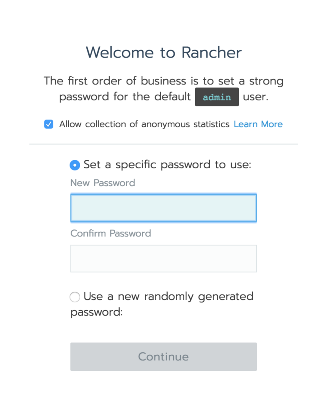在浏览器中输入刚刚你记录下来的EXTERNAL_IP地址,你需要接受Rancher默认安装的self-signed证书。这之后,会弹出欢迎界面,设置密码(记住它!)接着继续下一页。