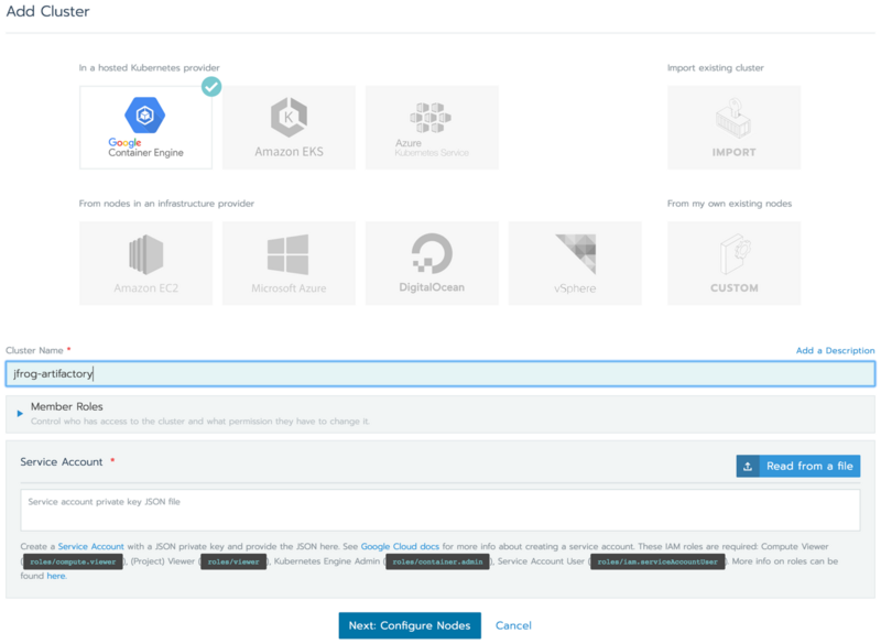 你可以把文件的内容粘贴到文本框中,也可以点击Read from a file,选择key.json文件。Rancher将使用该信息生成一个页面,在页面中配置你的新集群: