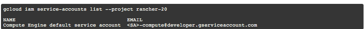 要创建集群,Rancher需要访问Google Cloud Platform的权限。这些权限可以通过Service Account的私钥JSON文件获得。如何产生它呢,首先找到service account的name(根据你的情况修改project的name):