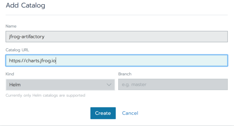 和Kubernetes中的其他工具一样,我们有多种方法来安装Artifactory。这里我们将使用Helm chart,Helm提供了一种给应用程序安装命令打包及分享给他人的方式。你可以把它想象成服务于Kubernetes的包管理者。在Rancher Catalog(应用服务目录)中,Rancher集成了Helm,在Catalog中你只需要点击几下就可以部署任何Helm支持的应用程序。除此之外Rancher还有其他特点,包括: