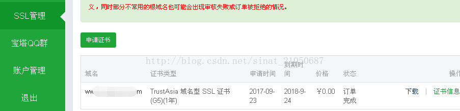 2.查看宝塔后台自己申请的经度,看到以下,先把ssl证书下载,然后就可以去配置服务器啦!