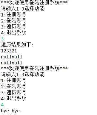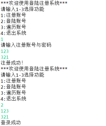 用户可以输入对应的编号进行相应的功能操作。例如输入“2”进入注册功能,输入用户名和密码进行注册。