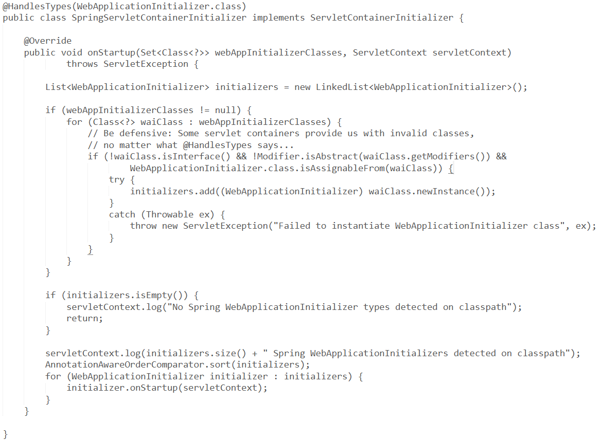 这个自定义类必须实现 ServletContainerInitializer 这个类,这个类只有一个方法: