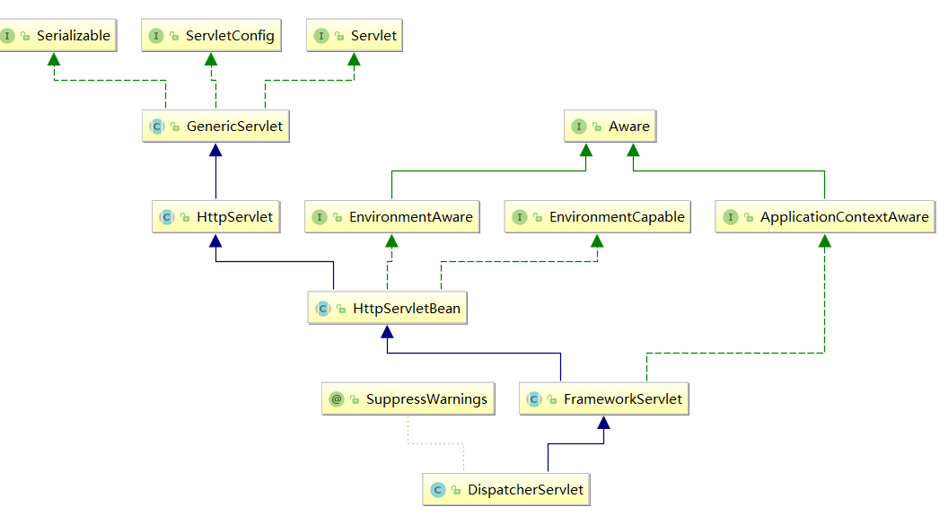 Servlet生命周期要求,每个Servlet在第一次加载时都会调用其 init() 方法,但是DispatcherServlet本身没有这个方法,所以系统会去它父类HttpServletBean寻找,然后执行,以下是 init() 方法原码: